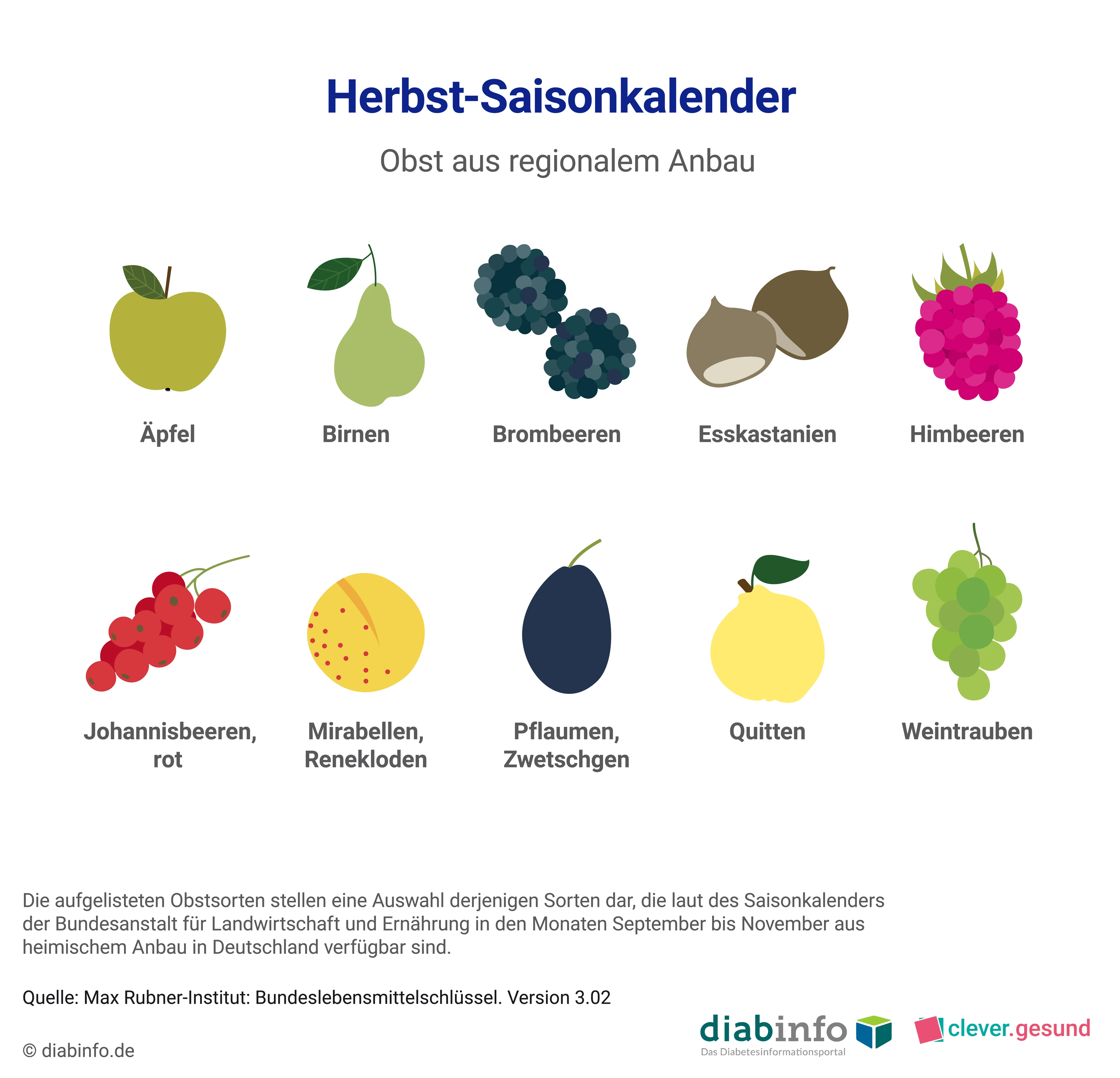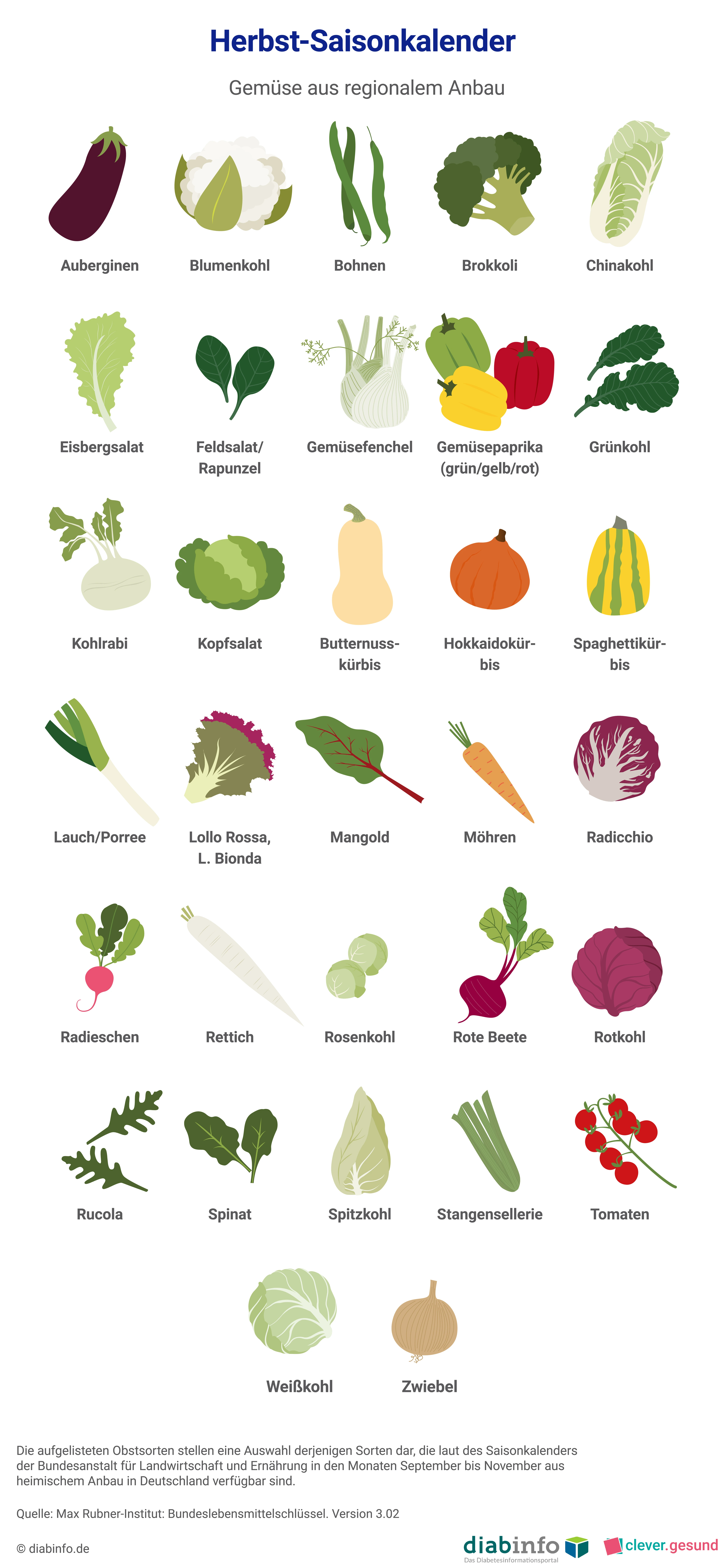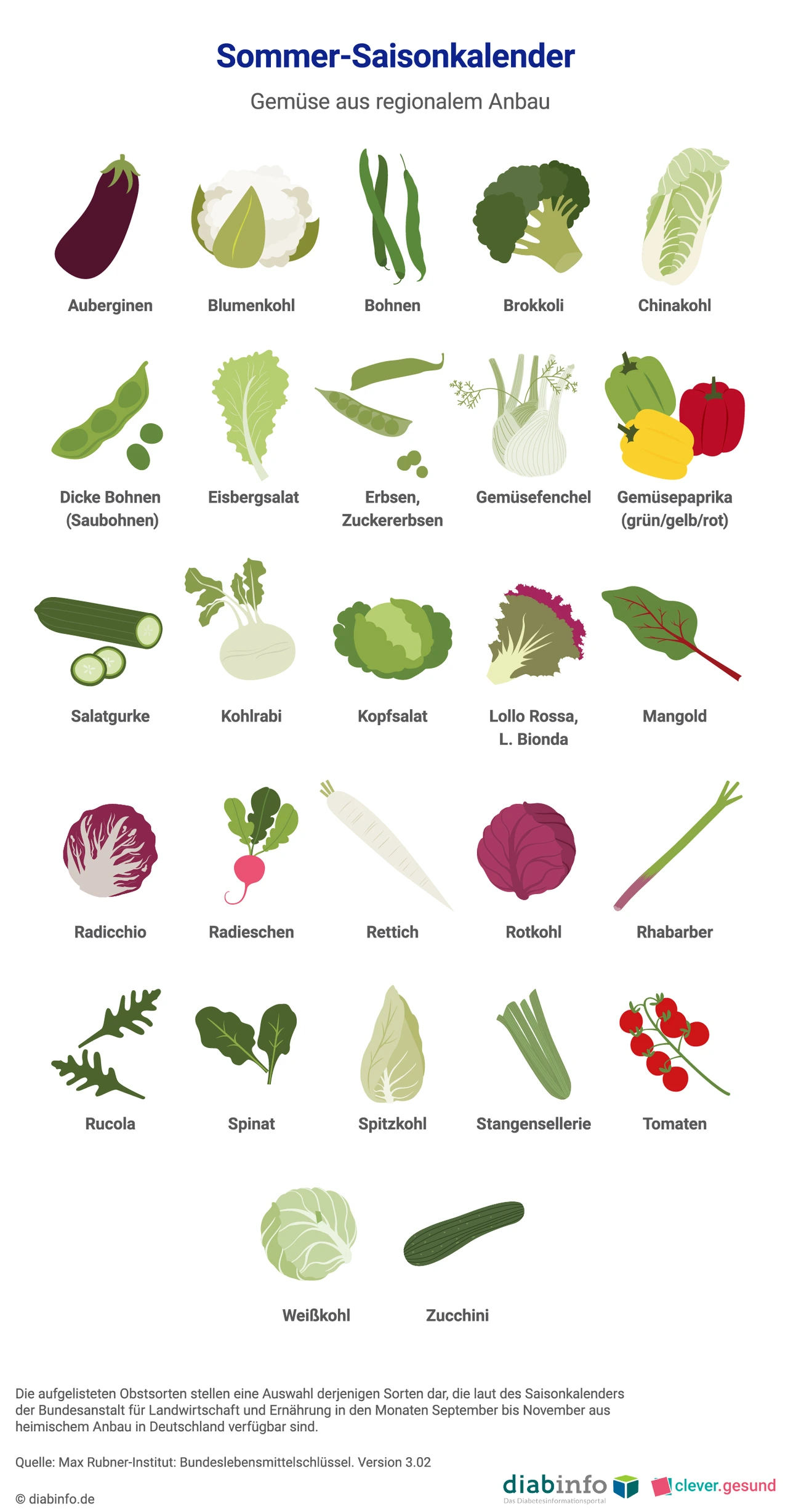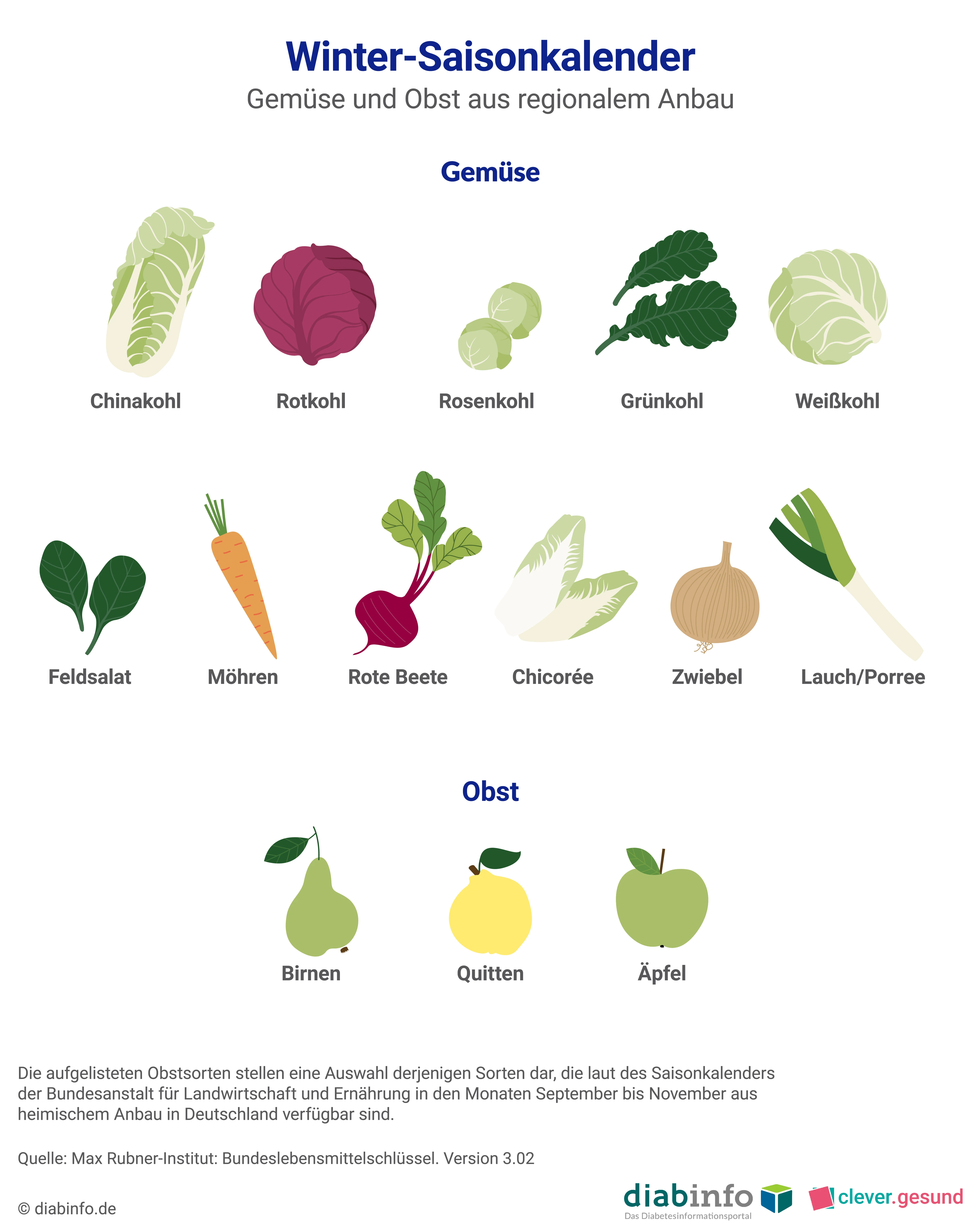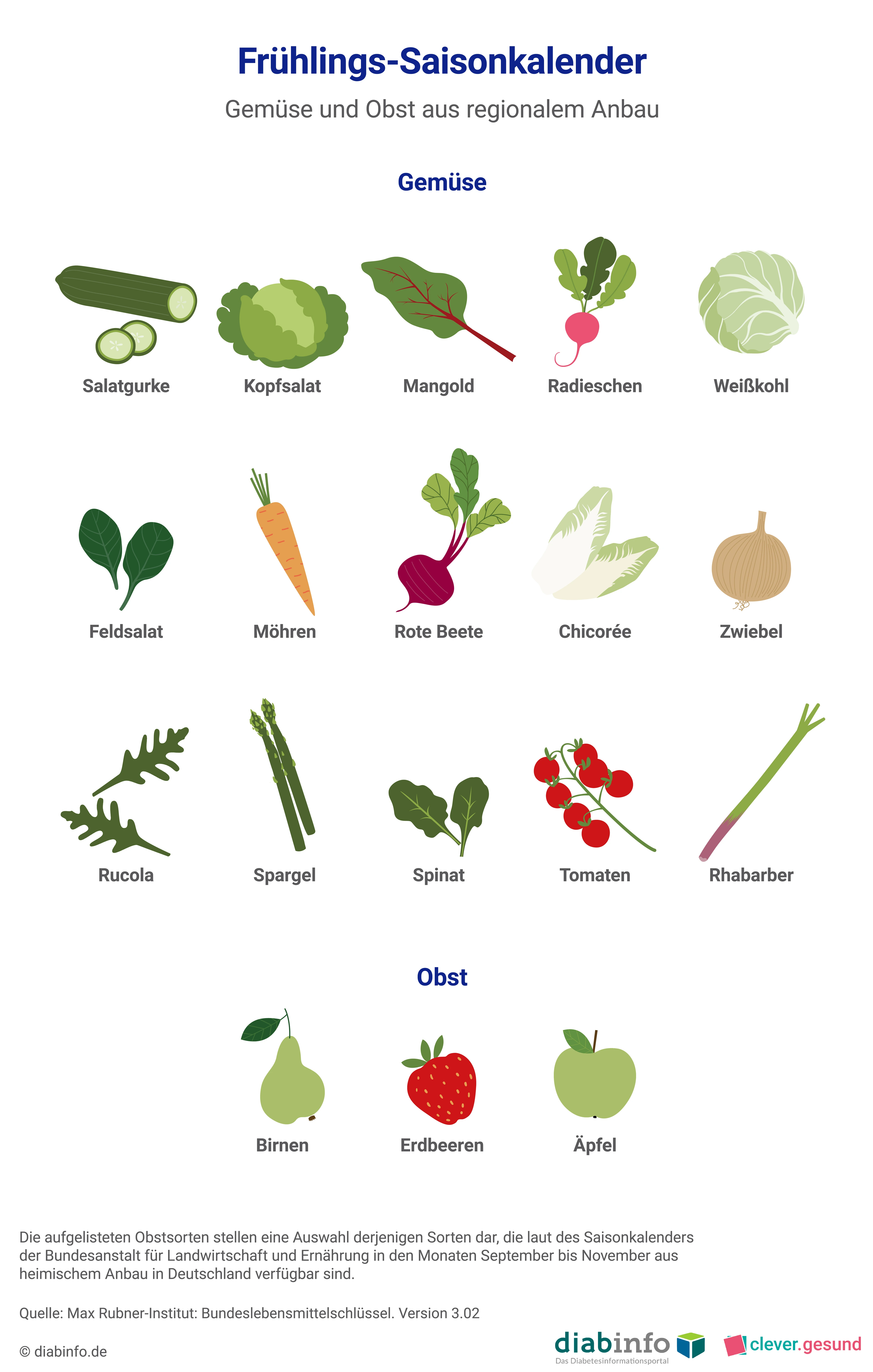 - Orientiere dich beim Einkauf an Saisonkalendern: Obst und Gemüse haben je nach Sorte unterschiedliche Saisonzeiten im Jahr. Sie müssen in diesen Zeiten nicht lang gelagert werden, was viel Energie kostet. Dabei wird nicht nur das Klima geschont, sie schmecken auch besser und sind meist günstiger. Bei uns findest du Saisonkalender für jede Jahreszeit. Die Saisonkalender wurden uns von unserem Partner diabinfo.de - Das Diabetesinformationsportal zur Verfügung gestellt. Dort findest du aktuelle, neutrale und wissenschaftlich geprüfte Informationen zu allen Formen des Diabetes mellitus sowie zur Vorbeugung von Diabetes.